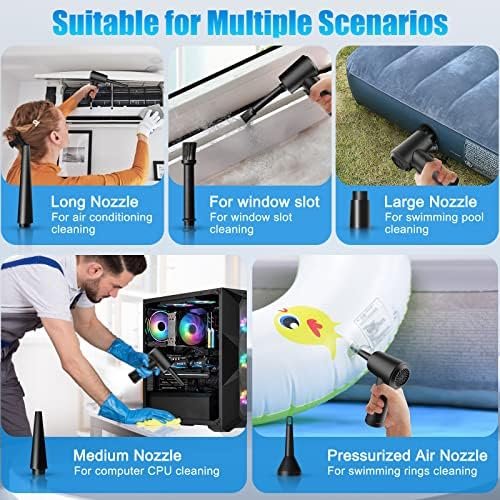 - Multiple Nozzles & Wide Application: BOLNGLA computer air duster comes with 5 sets of nozzles, meeting different needs. Suitable for dust removal of computer cases, keyboards, cars, fans, lily windows, etc. The multifunctional nozzle is used to inflate swimming rings, yoga balls, steamboats, air mattresses, inflatable toys, etc.