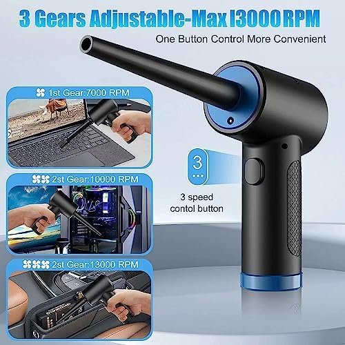 - Rechargeable 7500mAh Battery & Fast Charging: BOLNGLA cordless air duster has a built-in large capacity 7500mAh lithium battery and allow this duster to run nearly 25-30 minutes continuously. Comes with USB-C fast charging cable, fully charged within 4 hours. It can be charged by computer, mobile power, car charger, adapter.