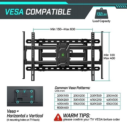 - Heavy Duty TV Wall Bracket: Equipped with 6 solid heavy duty arms and premium mount base with strong cold rolled steel, tv wall mount can hold large TVs up to 132lbs, and the ultra-strong tv mounting bracket has passed the load bearing test,which is sturdy and safe
