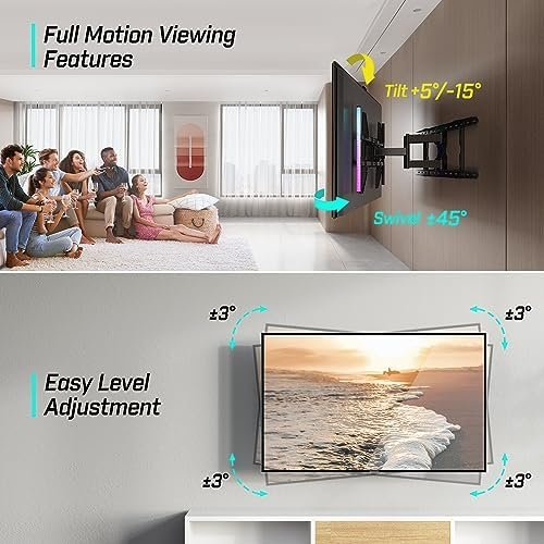 - Full Motion TV Mount: Tilting your TV screen up 5° and down 15° to reduce glare, swivel tv ±45° and level adjusts ±3° for maximum viewing flexibility. Retract 3.4” for space saving, extend 14.6” from wall for optimal positioning. Greenstell tv wall mount can help you feel comfortable during tv time at family gatherings