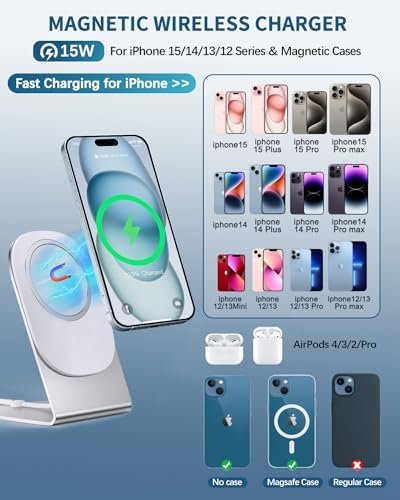 - Magnetic Charger for iPhone 15/14/12/13 Serious Specially designed for iPhone 15/ 15Pro/ 15 Pro Max/ 15 Plus, iPhone 14/ 14 Pro/ 14 Pro Max/ 14 Plus, iPhone 13/ 13 Pro/ 13 Pro Max/ 13 Mini, iPhone 12/ 12 Pro/ 12 Pro Max/ 12 Mini, AirPods 3/2 Pro and Mag-Safe case, it holds your cell phone stably and charges rapidly. iPhone Mag-safe charger is also quite easy to attach and detach your phone from the mag charging holder.