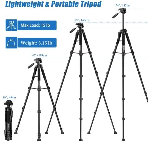 Tripod Camera Tripods, 74″ Tripod for Camera Cell Phone Video Photography, Heavy